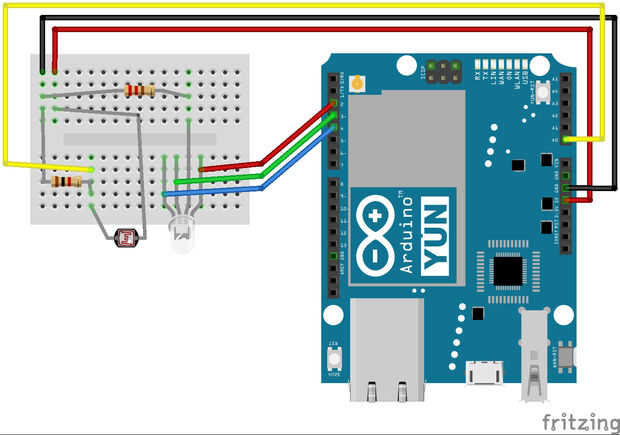 El fotorresistor se conecta a un resistor de 1KOhm, el LED es erathed por medio de una resistencia de 220 Ohm.