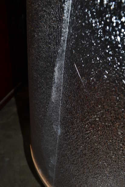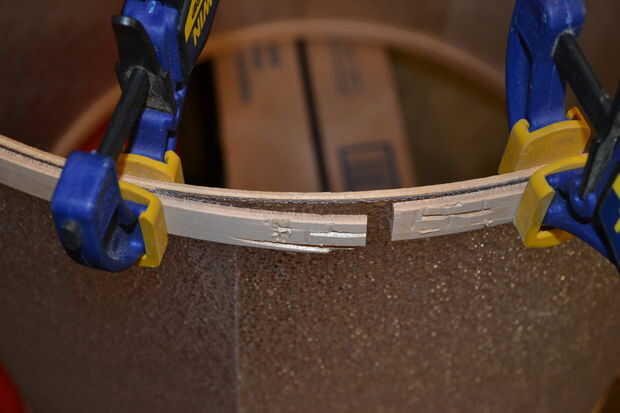Utilizando el bloqueo de las pinzas uno de los aros en lugar y luego quitar el tornillo que lo sostenía. Con un pico o pala plana de algunos tipo de saque en los bloques realizó el tornillo. Cuando los bloques están apagados y se limpia la zona utilice un fuerte epoxy para pegar ambos lados del aro en su lugar. Dejar que el epoxi totalmente set Quite las abrazaderas y repita el procedimiento en el otro extremo. Mientras tenga el epoxi que también puede pegar el traslapo en los extremos de la hoja. Esto no es una junta estructural incluso pegamento caliente funciona bien aquí.