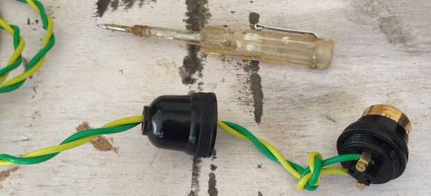 Paso 1. Pele el cable de extremos para el portalámparas. Fijar los tornillos del soporte como se puede ver en la imagen. Un nudo del alambre debajo de la tapa del soporte como se muestra en la imagen. Esto es importante porque este nudo va a soportar el peso de lo portalámparas, bombilla y la botella cuando por el cable eléctrico. Sin ella sería toda la carga de la lámpara, portalámparas y la botella en el empalme de cable con el portalámparas que no es tan fuerte.