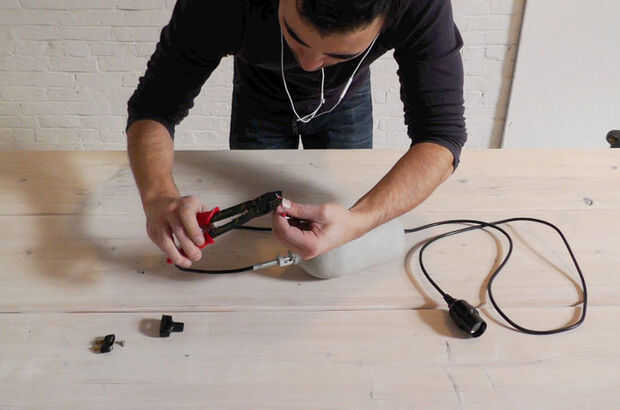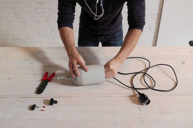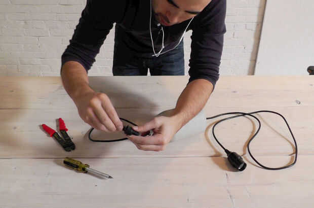 Corte el extremo de enchufe del cable e hilo del corte final aunque el agujero del tornillo. Pele los cables y girar juntos. Cubra el metal expuesto con cinta aislante o tuercas y asegurarse de que el colgante está firmemente sujeta.