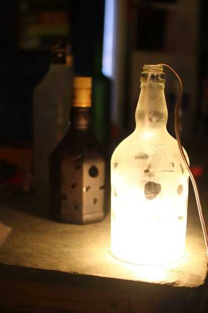 Poner un enchufe de la bombilla dentro de la botella aunque el cuello de la botella. Taladre un agujero en la tapa, un nudo en el hilo para que el cable de costumbre slip y soportar el peso de la botella. también puede utilizar el alambre usado para frenos de la bicicleta para la fuerza agregada y fijarlo en el soporte, para que no resbale.