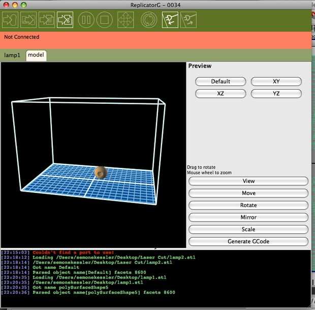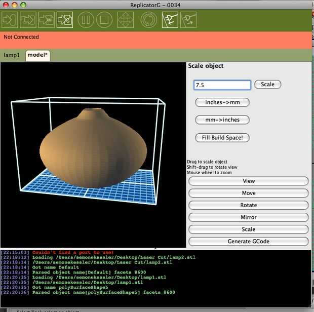 Haga clic en girar en el lado derecho y golpe X +, que debe girar el modelo a ser acostado en la red. Ahora haga clic en mover y golpear el centro. Clic en escala y 7,5 para el valor de escala y escala del golpe. El modelo debe aparecer mucho más grande y ahora será correcto para cortar. Para la referencia, no sé por qué la escala termina incorrecta al transferir los archivos de Maya a ReplicatorG. Si alguien sabe, encantaría saber por qué.