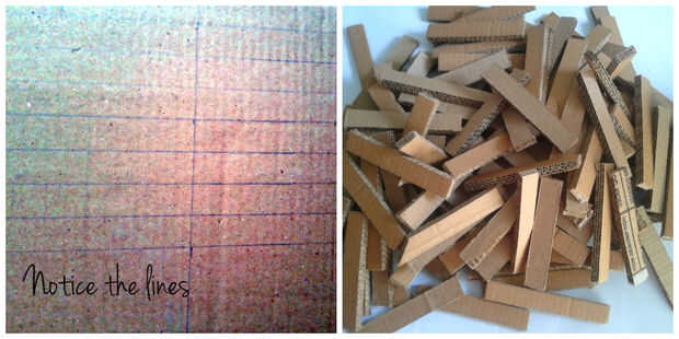 Tenemos que cortar sobre 140-145 tiras de cartón sobre. El tamaño de cada tira es 12 x 2 cms (largo x ancho), en mi caso.