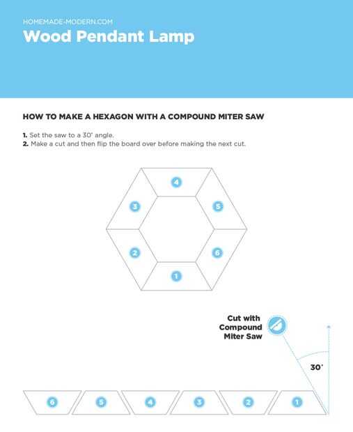 La lámpara es un cono hexagonal de 6 lados. Configurar la sierra para hacer un grado 30 bisel cortar y ajustar la guía de inglete a un ángulo grado 4. El bisel 30 grados corte debe ser muy preciso en orden para la lámpara trabajar. La guía de ingletes se puede en una variedad de ángulos diferentes dependiendo de cómo agudamente desea el cono a cono.