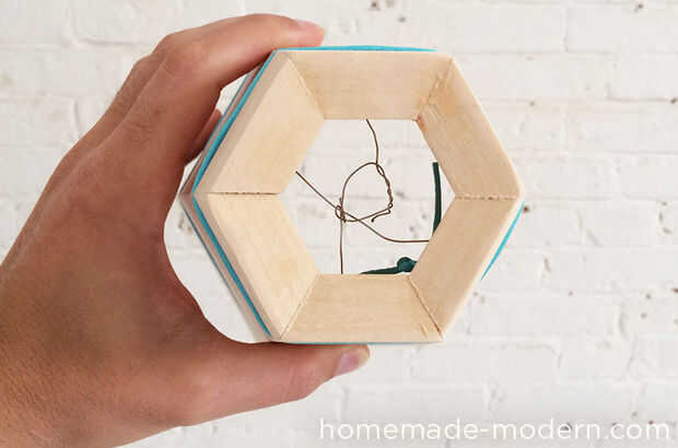Después de enhebrar el cable a través de la lámpara de madera, taladrar 4 orificios en la ranura y alambre usado para hacer una red que mantiene el zócalo en el centro de la pantalla. Empuje las partes exteriores de los cables en la ranura.