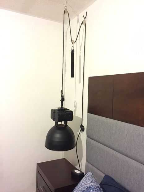 Una vez que tenga todo junto es muy simple poner en el lugar. empecé con la polea en la parte superior de la pared y manteniendo el hilo tan largo como sea posible, entonces la polea en el techo. Finalmente, ajustando el contrapeso. ta da! de basura a tesoro.
