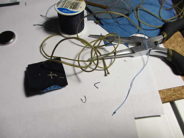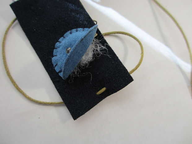 Ahora, tire del cordón firmemente para que el colgante se dobla por la mitad. Tomar el hilo conductor que se une a la resistencia y coser en la parte trasera de la botonera. Cosido un + para recordarme que es el lado positivo.