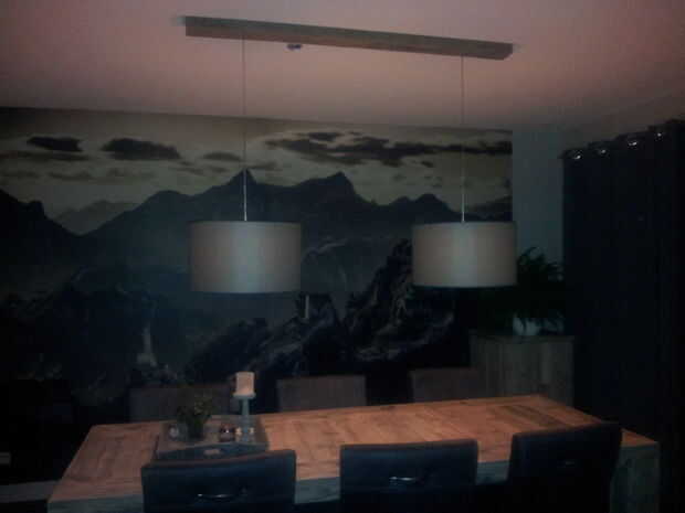 Este sistema de lámpara de suspensión consta de 4 cables conectados a una pieza central de madera. Cuatro bombillas en los cables de la linterna se roscan a través de orificios en la pieza central de madera.Este diseño es perfecto para definir un esp