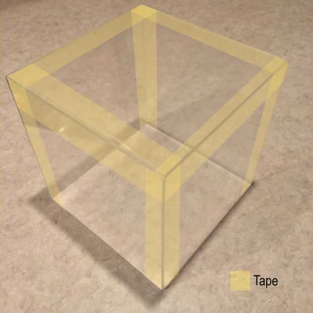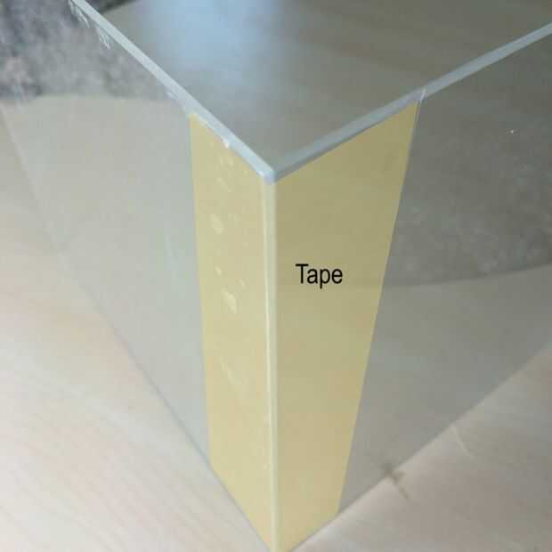 La mejor manera de formar las hojas de acrílico de un cubo es empezar sosteniendo dos hojas a cada lado algo en su casa que tiene una esquina de 90 grados y cinta las hojas juntas. Por ejemplo, la esquina exterior de la mayoría de paredes tienen generalmente una esquina aguda 90 grados que funcionaría bien para esto. Una vez se han grabado dos o tres piezas usando este método, el cubo debe poder estar parado en su el propios por ahora, lo que es más fácil hacer el resto con la mano (o sin el método de la pared). Después de que sea capaz de valerse por sí mismo, completar el cubo añadiendo hojas de acrílico para terminar todos los lados del cubo (excepto la inferior). Consulte las fotos para ver cómo debe colocarse la cinta.