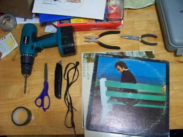 usé sólo herramientas y materiales que ya tenía en mi apartamento. Utilicé un cordón, algunos cinta eléctrica, una lámpara antigua, dos viejos discos usados, tijeras, un cuchillo, alicates y un taladro.