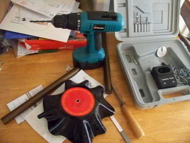 y, mi lámpara solo trenzado aparte en tres secciones, decidió acortar la lámpara por una sección y poner en dos estantes de discos de vinilo. Después de cortar el alambre en la parte superior de la lámpara y dissambeling la lámpara, usé un taladro para ensanchar los orificios en los registros hasta que pude tornillo de registro sobre las piezas de la lámpara. Esto no es un método seguro y recomendable, pero funcionó.
