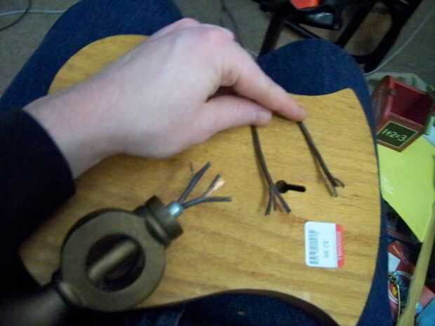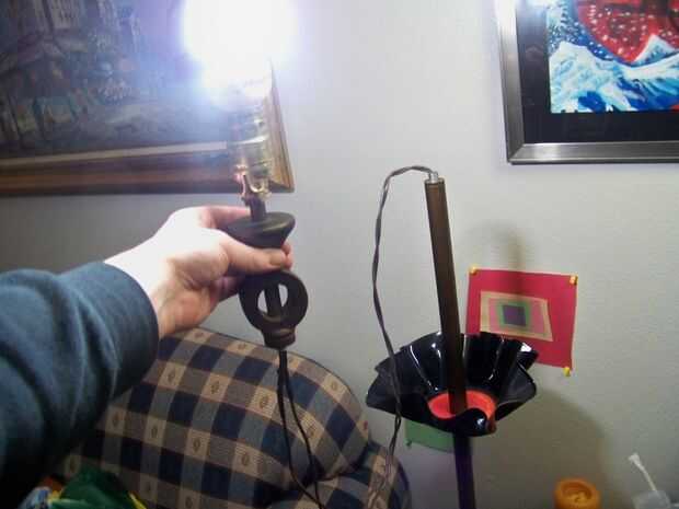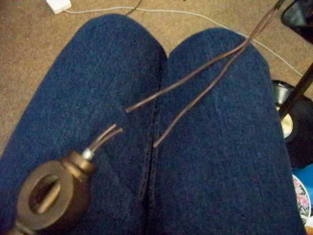 Al llegar a la parte superior de la lámpara, debe volver a conectar los cables.  Para ello cuidadosamente despojada de la cubierta del cable y torcidos los cables de nuevo juntos.  Luego envuelve el alambre atado firmemente con varias capas de cinta aislante.  Después de hacer esto, he probado la lámpara con una bombilla para asegurarse de que enciende antes de proceder al acabado de la lámpara.