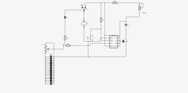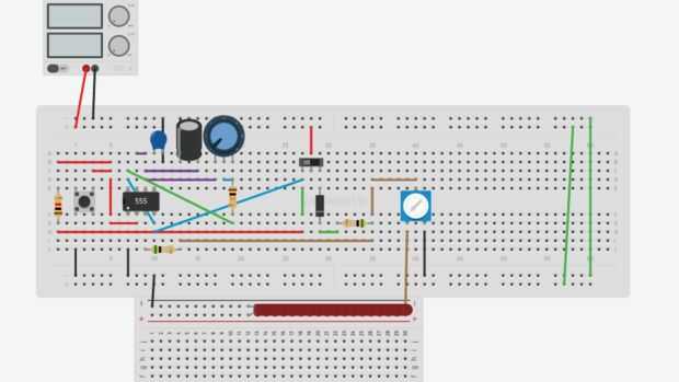 Se trata de un circuito monoestable, uno de los circuitos más básicos 555; tiene dos Estados distintos, uno de ellos estable (con un voltaje constante) y el otro inestable (teniendo un voltaje inestable o variable). Normalmente, el circuito está en condición estable. El circuito puede extraerse la condición estable temporalmente por un pulso de entrada llamado una señal de disparo. Después de un cierto período de tiempo, que se puede ajustar o configurar eligiendo valores de los componentes específicos