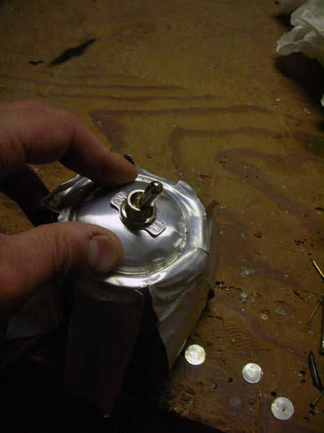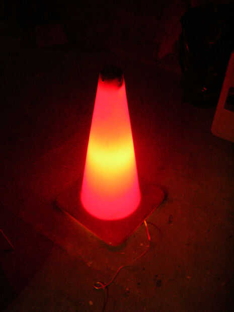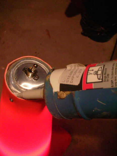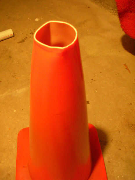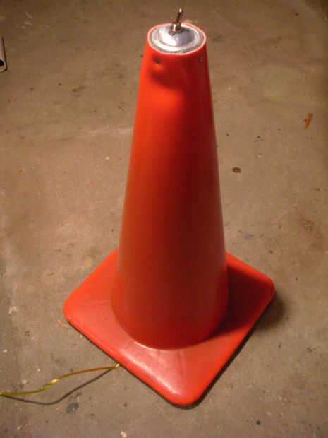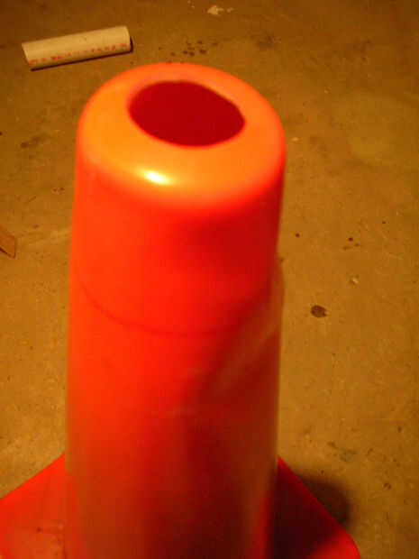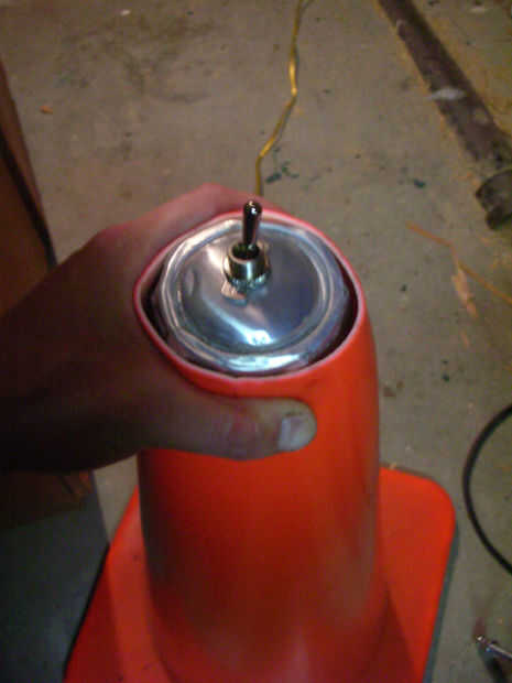 Corte el cono aproximadamente dos pulgadas desde la parte superior, o donde se pueden determinar los ajustes de interruptor de montaje firmemente. Pase los cables a través, entonces el montaje Interruptor/tubo. Alinee el borde de la lata al ras con el borde del cono y sosténgala firmemente. Atornille a través del cono de la tubería a los lados. Hice cuatro tornillos, un eje, luego el otro, así que podía siempre asegurar que todo fue al ras cómo quería ser. Poner algún sellador de silicona alrededor para terminar la orilla.