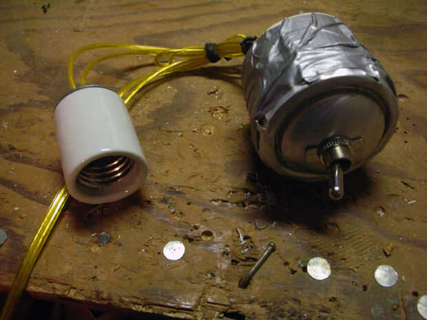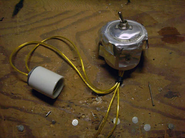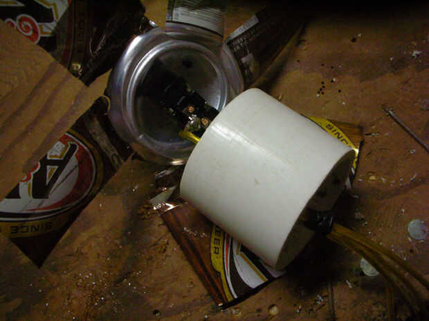 En primer lugar, tome el pequeño pedazo de PVC que se corta antes y pase todos los cables a través de él, por lo que el pueden sentarse abajo y el interruptor en la parte superior. Doblar las aletas abajo, taladre un orificio guía a través de algunos de ellos y atorníllelos hasta el plástico. Envuelva todo esto en alguna cinta para apretar todo y cubrir los bordes afilados. También puede utilizar cinta adhesiva como una cuña cuando llegue el momento de colocarlo en el cono, si haces el agujero en el cono demasiado grande.