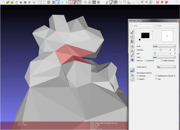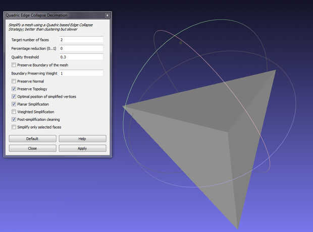 Luego esta exportado como un archivo .obj e importado a MeshLab, filtro seleccionado > Remeshing, simplificación y reconstrucción > cuádrica borde colapso diezmado y con caras de 500. Editado un poco el objeto y reduce la cantidad de caras donde pude si todavía parecía agradable. Busque los consejos de edición en el cuadro, podría ser útiles para un usuario por primera vez como les fue. Exportar como archivo .obj cuando usted no puede hacer ningún cambio digno ya. También recuerda guardar tu trabajo a menudo como un archivo .obj, no proyecto de MeshLab (abertura que uno le pone en la línea de salida otra vez). Guardar siempre antes de experimentar con nuevas opciones y cosas similares. MeshLab tiende a bloquearse, especialmente cuando piensas en "oh has hecho tanto sin que falle, solo va a hacer esta última cosa... fuuuuuuuuu! «.