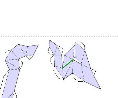 A continuación, importar el modelo .obj facetado en Pepakura y después de un poco de frustración hasta que figura cómo hacer algo bien Editar unas cuantas cosas más: mover vértices o borrar algunos bordes, especialmente en los lugares donde hay pequeñas caras en duro doble o lugares, que le ahorrará algunos frustración más tarde - cuanto más tiempo pasas refinando el modelo de Meshlab y Pepakura , menos trabajo tendrás que plegar y pegar. Escalar al tamaño deseado y colocar las piezas en hojas de papel, encajo en dos hojas A3 (tuve que cortar el gran tamaño A2 tenía a tamaño).