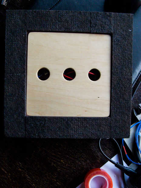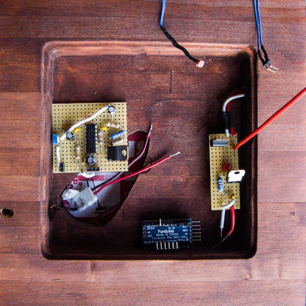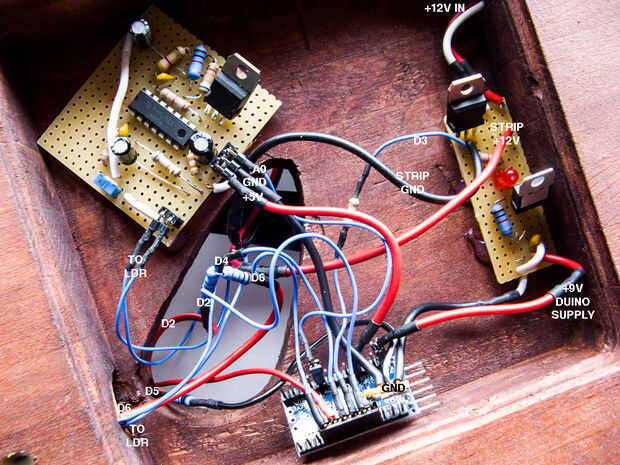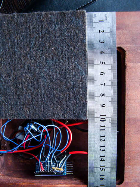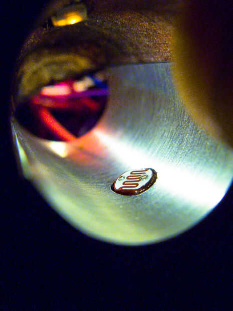 Alineación de la placa de acero para el dedo es simple - sólo utilice el mismo taladro utilizado para hacer los agujeros para el LDR en madera y acero. Alineación de la LDR es un poco complicado sin embargo. Debe terminar siendo un poco más sobre el acero para lecturas estables, pero no lo suficientemente altos para moverse o evitar que entre en contacto con el acero. Es una buena idea intentar correr el circuito para ver qué tan alto necesita lecturas decentes. Cuando tienes el punto dulce - pegamento en su lugar. Lo hice usando una buena cantidad de pegamento directamente en el orificio en la parte inferior. Debe señalarse también que los cables delgados de la LDR pueden doblar si se aplica mucha presión en él y no ir el pegamento caliente a lo que era el caso para mí y conducido a la LDR es un poco inferior al deseado. Por suerte, no arruinar mis posibilidades de conseguir lecturas adecuadas, sólo llegó a ser un poco más sensible a la posición del dedo, así tenlo en cuenta cuando se encole.