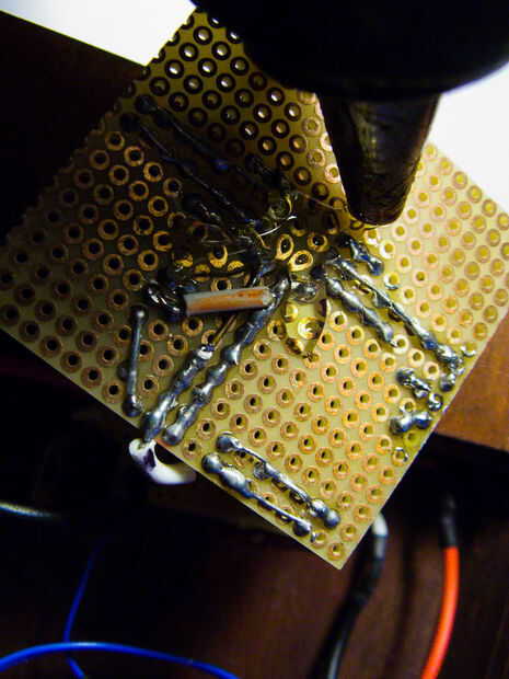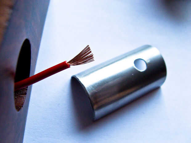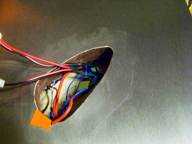 Los cables del sensor capacitivo fueron atados a la superficie del acero simplemente extendiendo los cables hacia fuera un poco para dar más área de contacto y pegar luego en con pequeños pedacitos de powertape (ver fotos). Me encantaría les de la soldadura, pero no tiene la pasta necesaria para acero inoxidable.