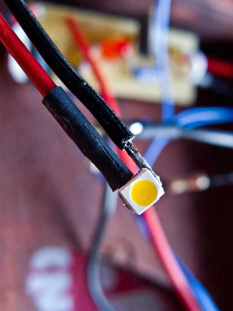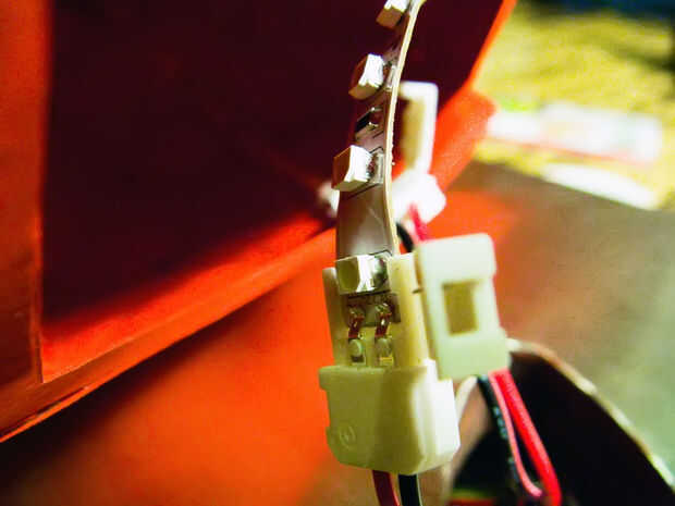 Tiras de LED fueron pegadas en el corazón antes que poner en la base, ya que es más fácil llegar a ellos para pegar de esa manera. Esto no debería ser un problema. Utilicé dos conectores de la tira (podría haber soldado por supuesto) y un pedazo largo de 225mm conectado a uno de ellos y 75mm soldadas a la pieza de 150mm conectado a la segunda. Se puede ver en las fotos. Los cables entre los dos pedazos eran alrededor de 90mm de largo y fue la pieza más corta cerca de la aorta. Este tipo de división ayudó con el corazón de la iluminación más uniforme.