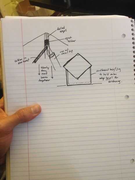 Gancho agarrador ahora sus tablas y algunos con cinta y construcción poco a poco su cubo con cinta adhesiva cada uno afrontar juntos, haciendo pequeños ajustes aquí y allá para mantener sus bordes al ras y sin huecos. Enchufar el soldador Weller a calentar, luego coloque el cubo de tal manera que los bordes a soldar primero son tan nivelados con tierra posible, uso plantillas improvisadas o artículos para el hogar para esto, yo personalmente sólo uso una caja de cartón abierta. Tener el nivel de las costuras es muy importante para el éxito en forma limpia y sin desagradables goteos o salpicaduras de soldadura. Cuando la plancha está caliente, estañado y listo para ir, coge un cepillo pequeño para su primer cierre de flujo. Primero con la más fácil dentro de las costuras del cubo, que por supuesto es cóncava y gotas no deseados están a menos de un problema. Cepillar la zona con su flujo, luego seguir con el punto de soldadura cerca de sus esquinas en primer lugar, no suelde una costura toda sólo para darse cuenta de algo es fuera de control en otros lugares.