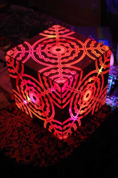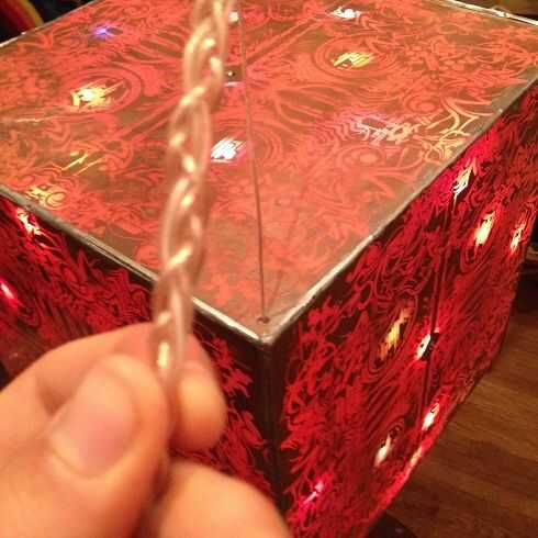 Si su lámpara es el más adecuada para colgar, obviamente deberá adjuntarse la cara final. Tomar esta cara superior para el taladro y poner un agujero en cada esquina para pasar un cable. Agarrar el alicate y cortar su fuente de alimentación de pared verruga en mitad, tira de los cables en cada lado. Ahora coge tu carrete de alambre de cobre y miden una longitud de alambre para colgar la lámpara, 8 pies era suficiente para mis necesidades. Duplicar esta longitud de cable para que ahora tenga 4 hilos totales, uno para cada esquina del cubo. Dos de estos cables será la fuente de alimentación de incógnito, los otros dos son simplemente apoyo y simetría. Conectar dos de estos cables a donde usted fuente de alimentación fue, tome nota de que utilizas y ejecutar todos los cuatro cables a través de su cara superior.