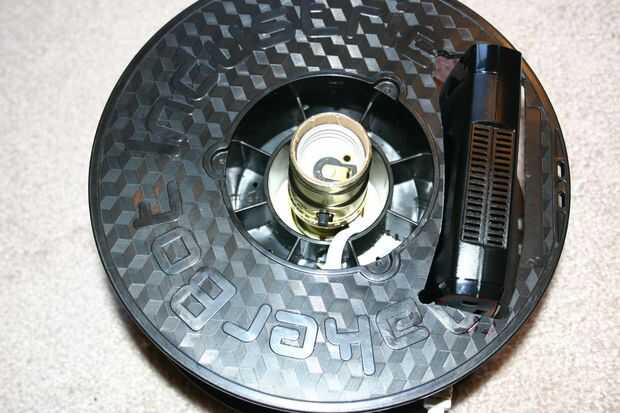 Con la lámpara a la posición "on", deslice a través de la bobina (que tenga que cortar parte del interruptor). En estás incómodo con el ajuste de fricción de la bobina, añadir un tornillo a través de la bobina en la Asamblea de sostenedor de la lámpara.