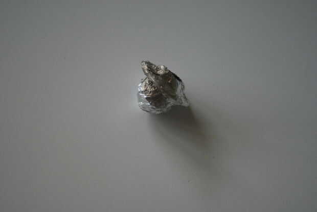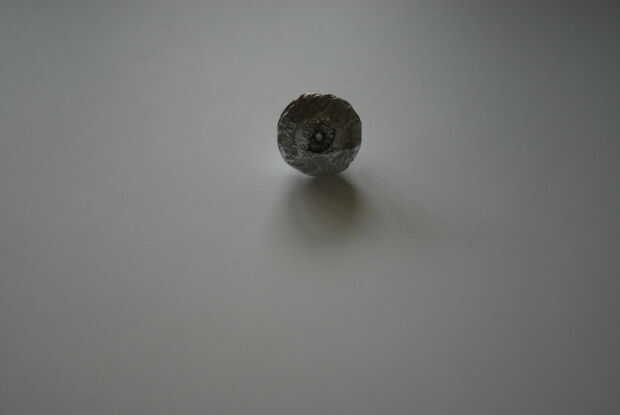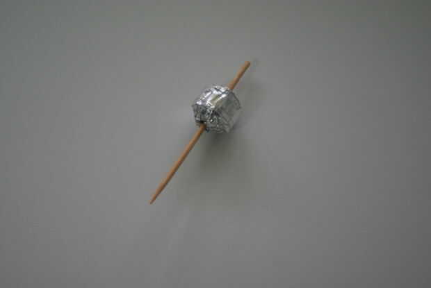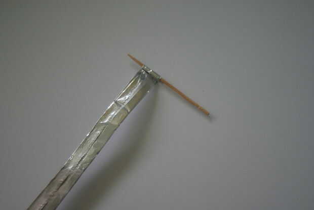 Tomar las tiras de papel de aluminio y enrollar alrededor de algo el tamaño de la mecha. Utilicé un palillo de dientes. Mantenga la envoltura en capas de papel de aluminio hasta que forma una especie de tapón de la parte superior de la jarra con un agujero en el centro del tope de la mecha.