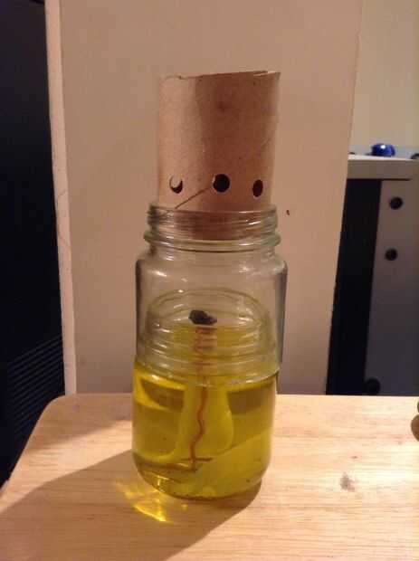 aquí es una lámpara de aceite realmente rápido y fácil. Funcionará muy bien para la iluminación de emergencia. Entré en mi garaje y unos 10 minutos más tarde lo estaba quemando rancio aceite de maíz, que por cierto mucha gente tirar. Usted se estar
