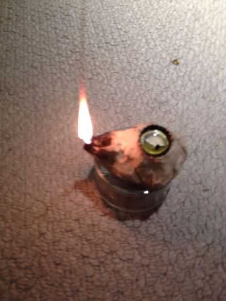 esto es una lámpara de aceite muy fácil de preparar que no produce casi humo y puede ser colgada de una rama de palo o árbol de tienda. Es también muy portable y lo puede llevar el aceite y la fuente de ignición con usted. Se trata de una lámpara efi