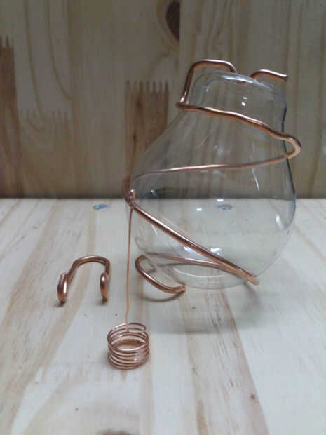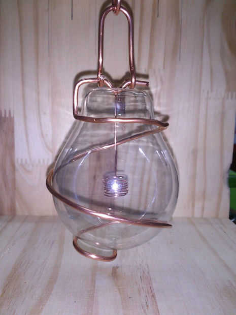 Me he dado cuenta, en orden a obtener el máximo brillo, la pieza de cobre que será expuesto tiene que tener forma de hélice, para hacer así que hice unos 7 lazos alrededor de una barra de metal de 1 cm (0,4 pulgadas) (mirar la primera foto para hacerse una idea), con el cable restante hice un gancho para colgar de la protuberancia como se muestra en la segunda foto.