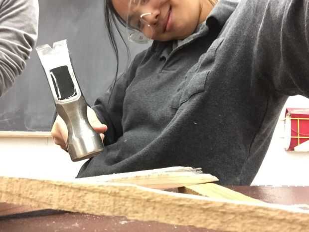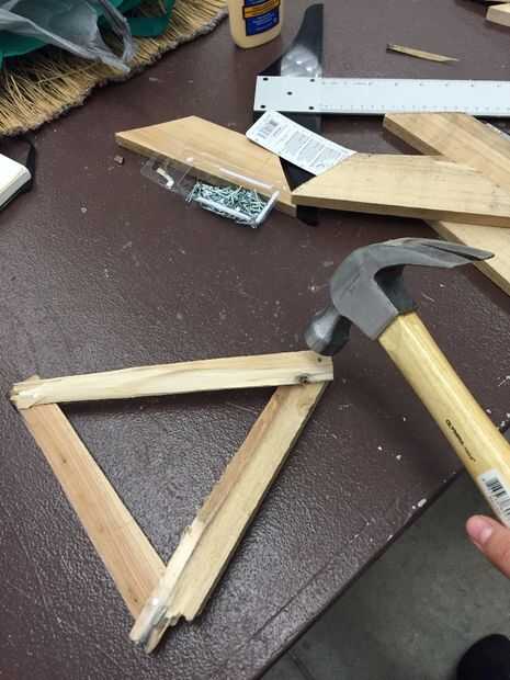 2. tres pedazos más cortos del martillo en un triángulo con clavos. Hacer dos de estos. Uno será la base y el otro servirá como la parte superior.