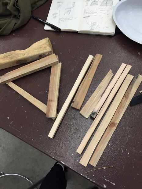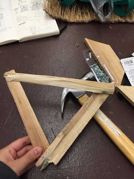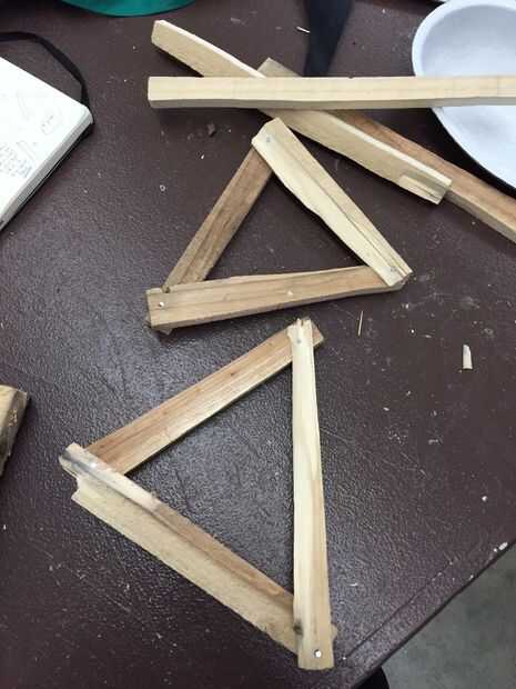 4. Continúe con todos los pedazos más largos y los dos triángulos han construido una estructura que se encuentra en su propio. Referencia a las fotos para mayor claridad.