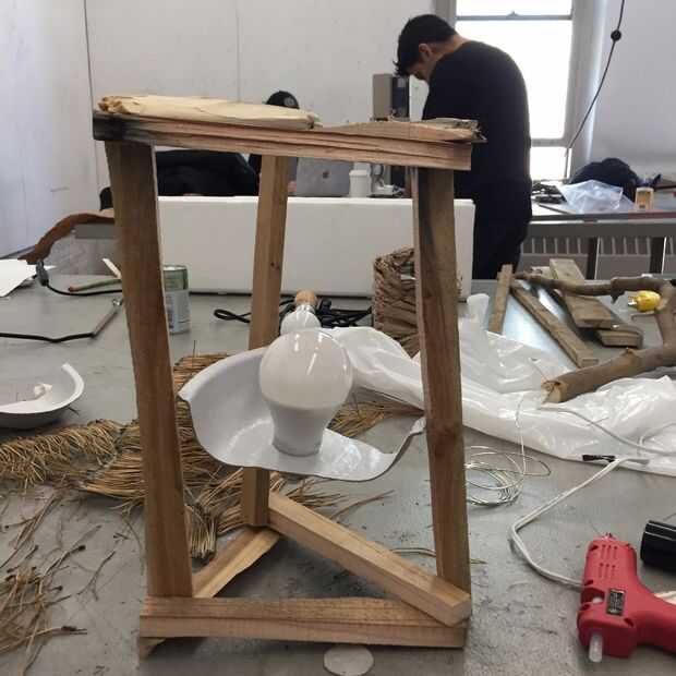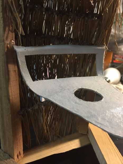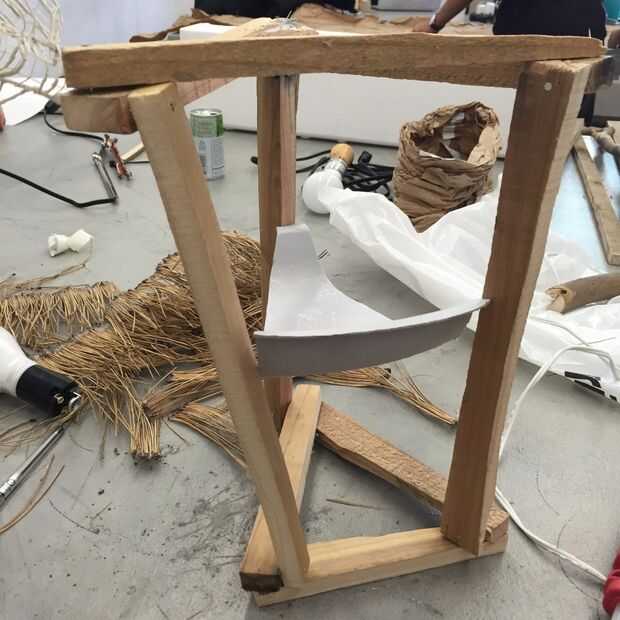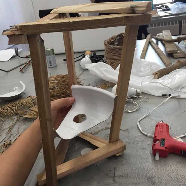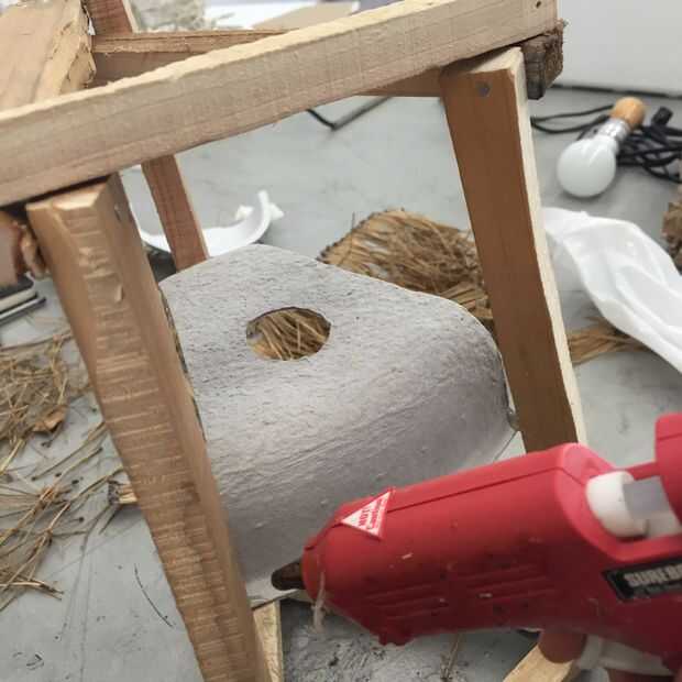 3. Coloque el recipiente cortado dentro de la estructura para que cada esquina toca una columna.