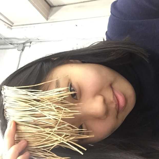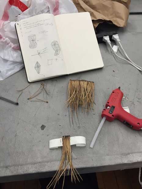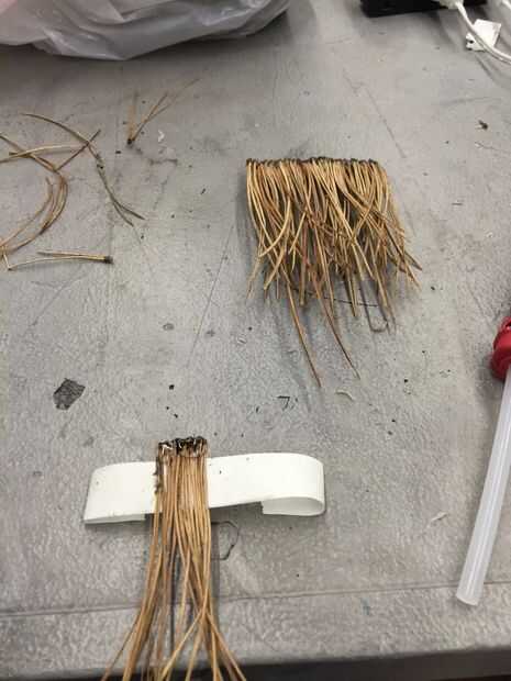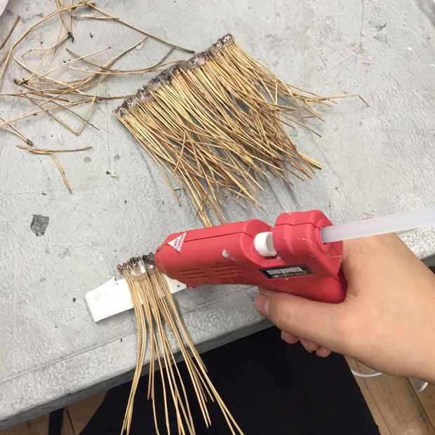 2. pegar las agujas de pino en la cinta para que queden paralelos, sin espacio entre.