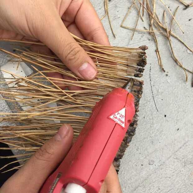 4. Continúe pegando pequeños segmentos de agujas de pino.