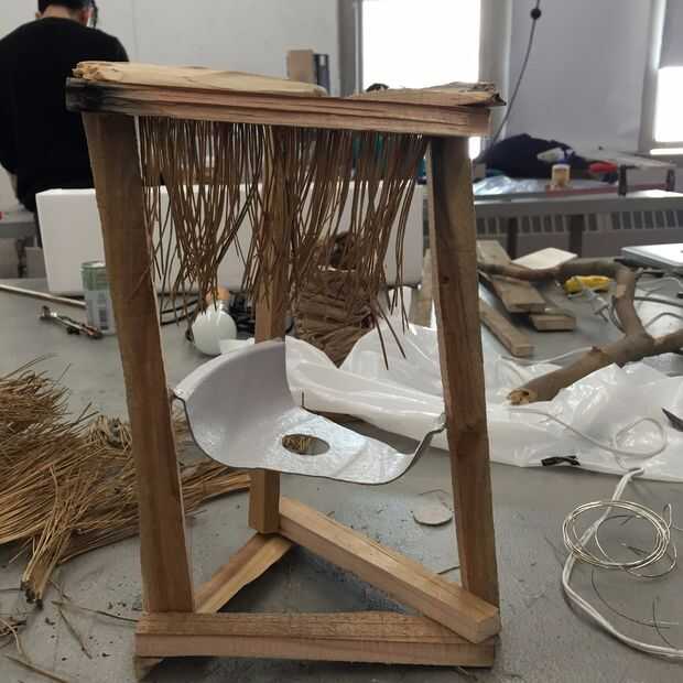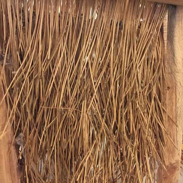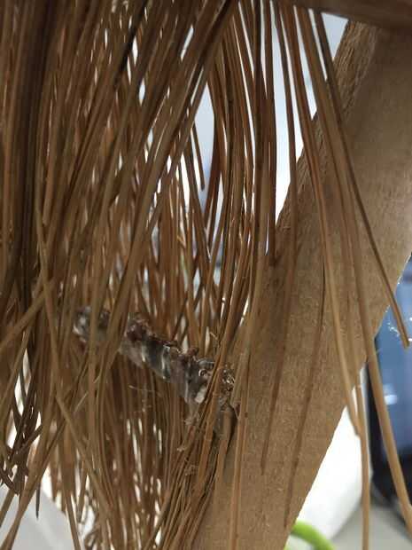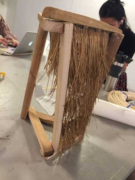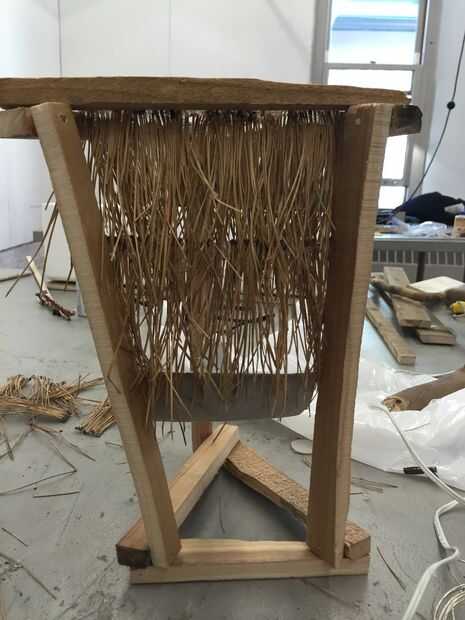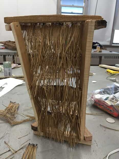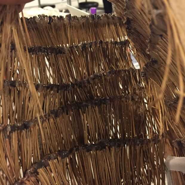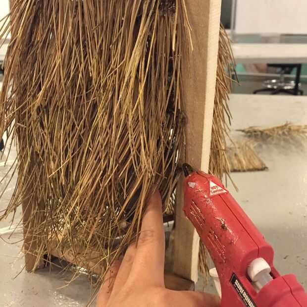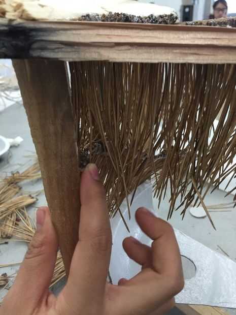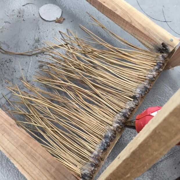 2. empiece a capa, va hacia abajo de la estructura. Pegue cada tira detrás de otro, para ocultar las puntas de las agujas de pino que han sido cubiertas de pegamento caliente.