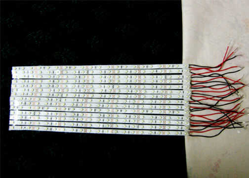 Después de la soldadura de un pedazo corto de alambre negro y rojo al borne negativo y positivo en la tira.