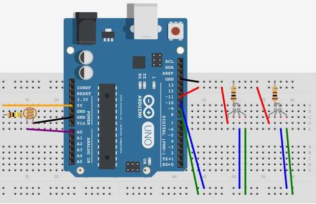 • Pin morado - A0 al carril con resistencia y resistencia de foto