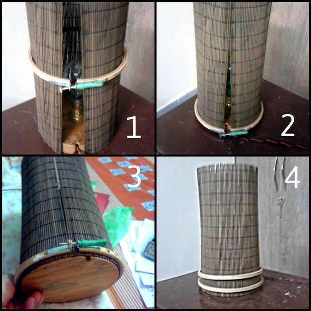 - Ahora estire suavemente la estera de manera que los dos extremos entre sí. Mientras haces esta alguien ha ayudar a apretar el anillo. (Imagen 3). Habrá brecha en la parte superior de la lámpara, así que estirar la alfombra un poco desde la parte superior y uso el clip binder pequeños unir los dos extremos.