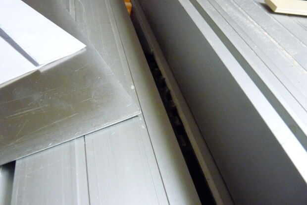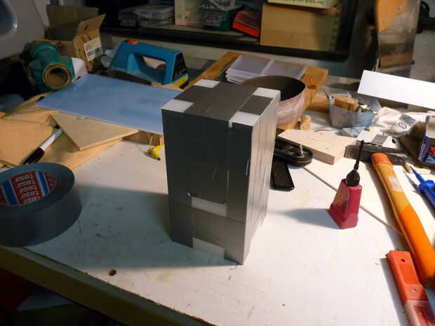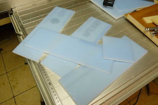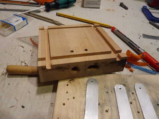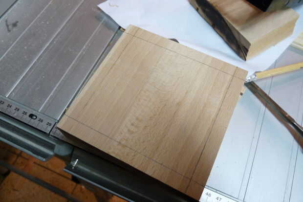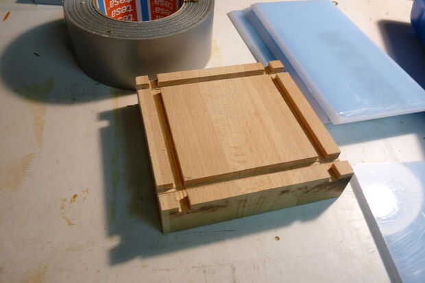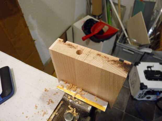 Baje la hoja a unos 5 mm und Deslice la parte superior de su bloque de madera a través de. Utilice las dimensiones externas como punto de partida y trabajo paso a paso (utilicé trozos de papel para las diferencias mínimas y controlables) hasta las paredes sin problemas encaja en la muesca. Trabajo siempre de la hacia fuera - en el interior, como errores de menor importancia (e.g. espacio demasiado ancho) no será visible desde el exterior y así no importa.