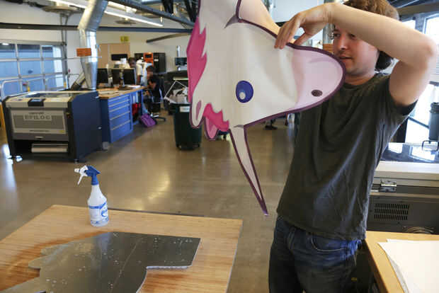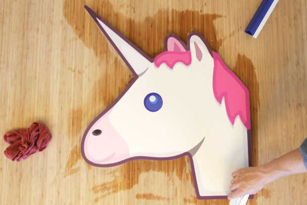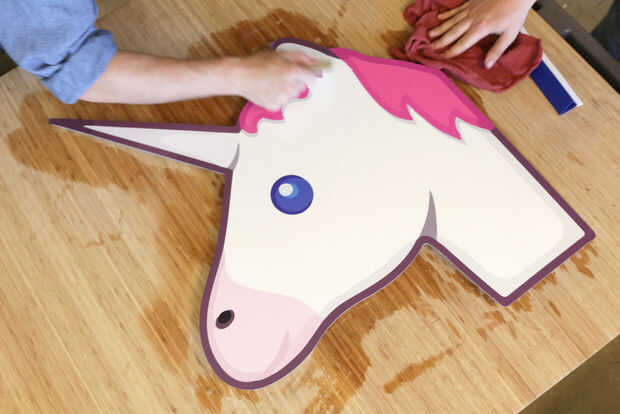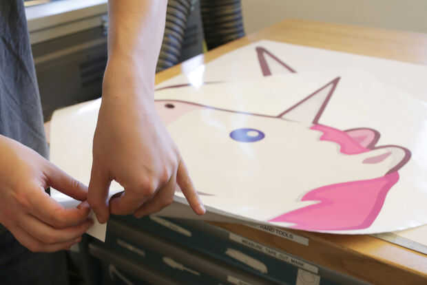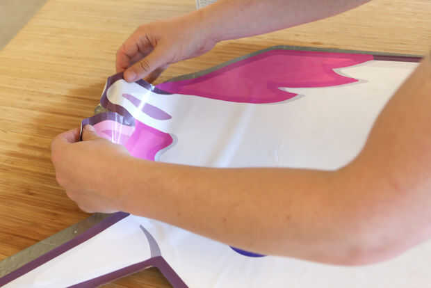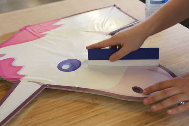 Pelar el vinilo de su respaldo y alinéelo con el recorte de unicornio de aluminio.