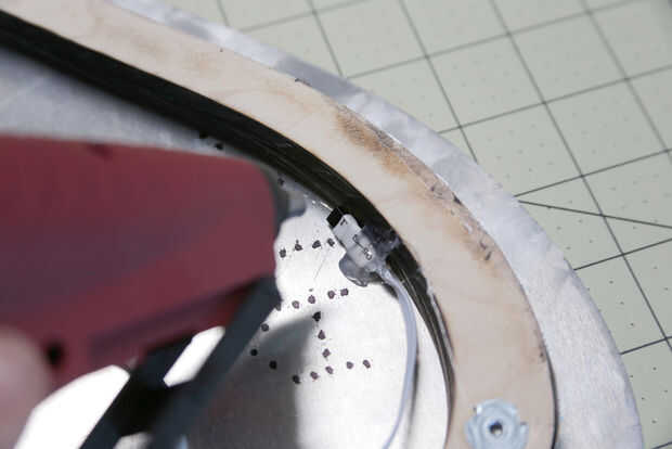 Pegamento con cuidado caliente la placa de circuito regulador dentro del marco que ninguno de los botones metálicos en el circuito en contacto con panel de aluminio.