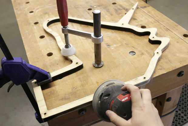Lije el borde externo del soporte de madera contrachapada para hacer liso. Esto le ayudará más tarde para aplicar el cemento de contacto.