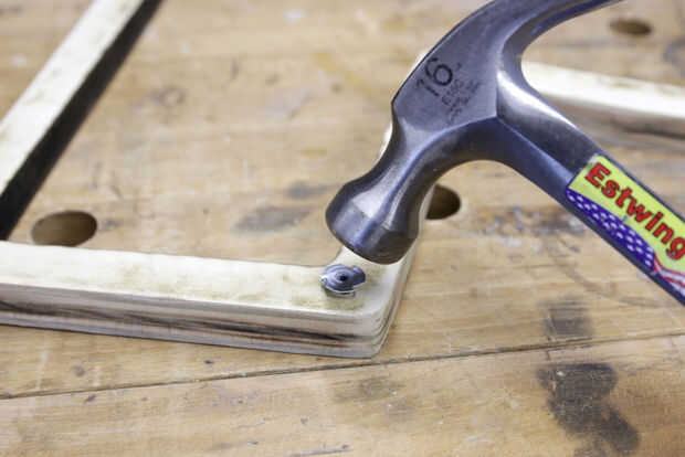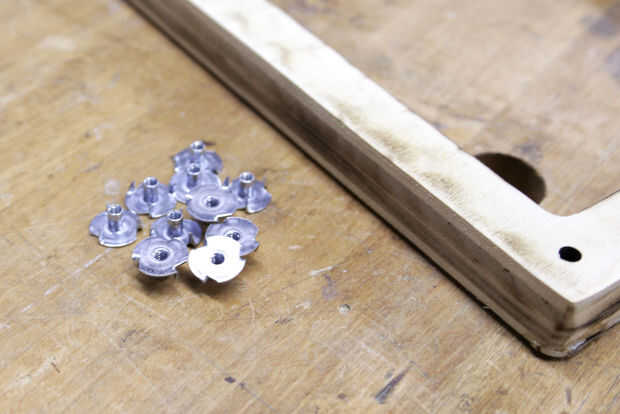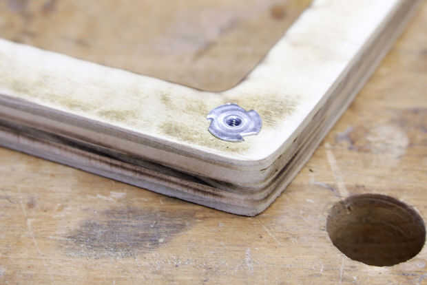 Voltee el marco de la madera contrachapada y un martillo entonces una tuerca tee en cada uno de los agujeros en el marco.