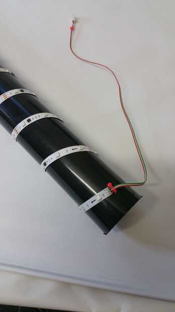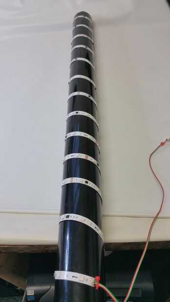 Había herida 2meters de aproximadamente alrededor del tubo negro y separó la tira llevada hasta que estaba contento con la forma en que veía, luego recortar la tira de Led en el siguiente punto de corte disponibles, que generalmente es indicado por pads de cobre adyacentes.