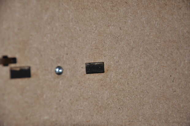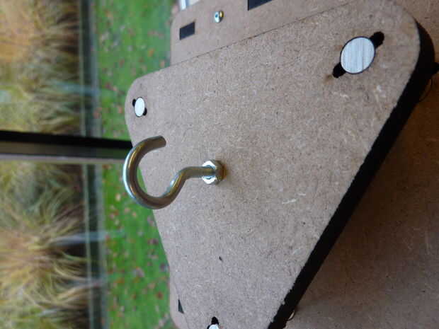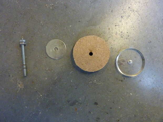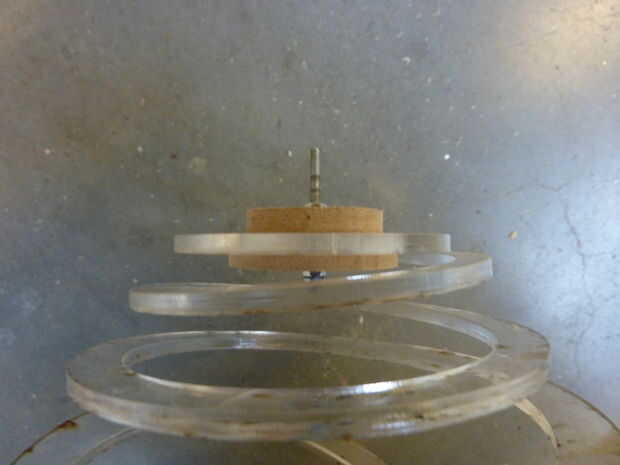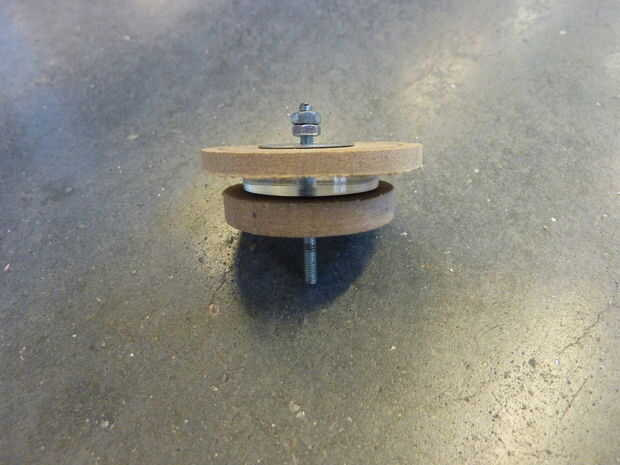 -Corta dos círculos de un trozo MDF de 3 mm con un diámetro ligeramente más grande que el pequeño círculo que ha sido lasercutted fuera del centro de la espiral y perfore agujeros los centros (3 mm de diámetro).