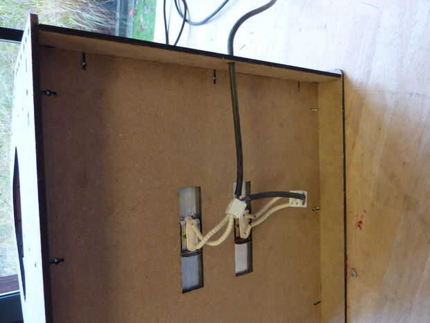 -Conectar los radiadores de infrarrojos para el cable eléctrico con los bloques de cerámica conector como se muestra en la fotografía. Asegúrese de que poner el cable eléctrico a través del agujero que se encuentra en la parte posterior.