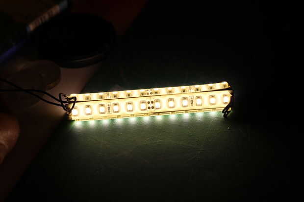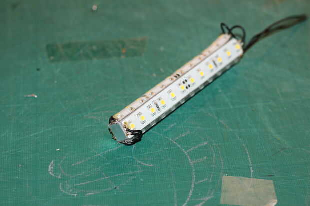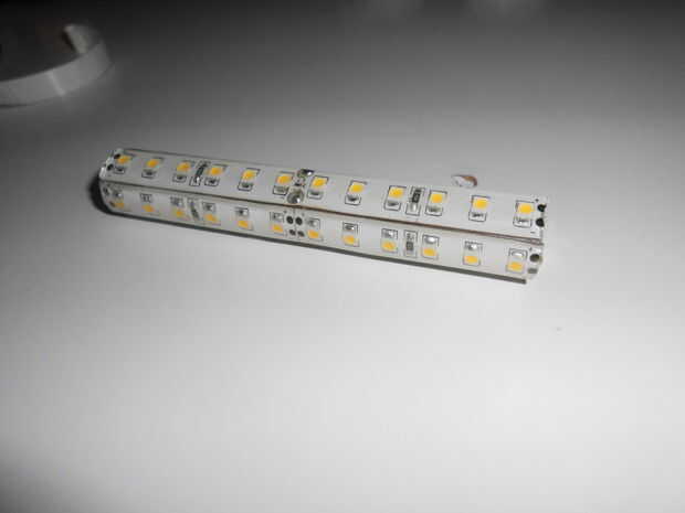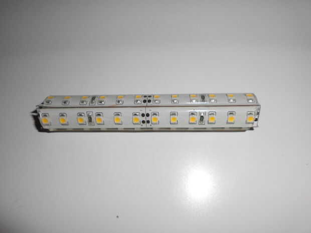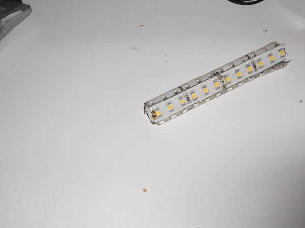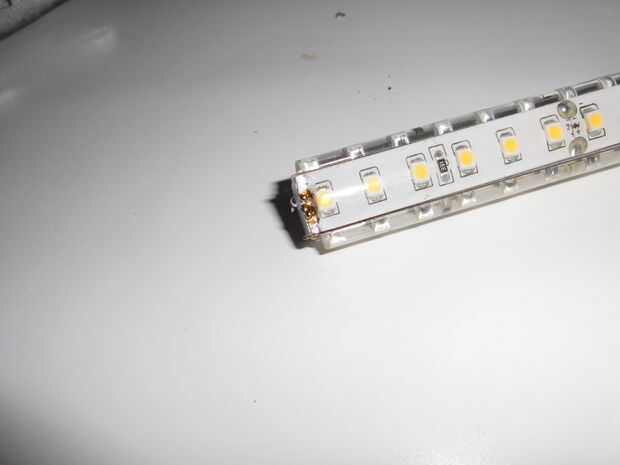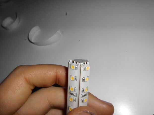 Soldadura + a + lateral en los 4 lados y - a - en todos lados. Dejar una parte abierta para conectar con interruptor y adaptador. Hemos puesto el led en serie. Puede colocar otro bloque en la parte inferior del perfil para asegurarse de que siempre se presione en el interruptor. Antes de empezarlo es importante para asegurarse de que se sueldan directamente sobre el cobre y no en la película bajo cero silicona fuera de la película primero. Después de haber soldado los LEDs en serie, compruebe si el LED se quema. Asegúrese de que los leds no son expuestos a fuerzas en los puntos de soldado cuando usted empuja en los extremos del perfil.