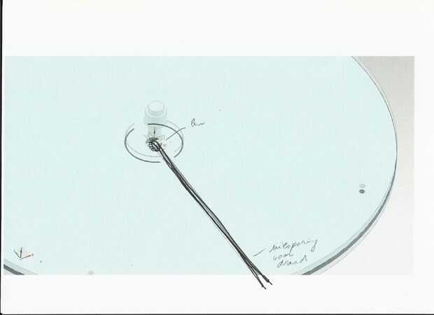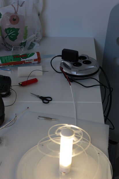 ¿Pruebe el conector por un momento y ver si todo funciona correctamente (todos los LEDS se quema? El switch funciona correctamente?) Asegúrese de que compruebe si necesita un 12V o un adaptador de 24V. Puede encoger encogimiento de calor blanco alrededor del cable de alimentación para un mejor aspecto. A continuación enrolle el cable alrededor de la pieza del centro en el medio del disco y el cable entre los discos superior e inferior.